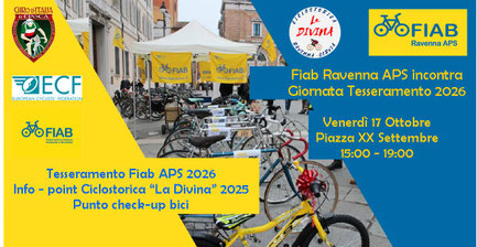 Venerdì 17 Ottobre in Piazza XX Settembre (dell'Aquila) a Ravenna dalle ore 15:00 alle ore 19:00 verrà installato un punto informativo Fiab ravenna APS (gazebo) con esposizione di bici d'epoca. Sarà l’occasione per potersi tesserare per l’anno 2026 alla Fiab Ravenna APS (tutte le info anche su : https://www.fiabravenna.it/tesseramento/ ). Sarà possibile, inoltre, avere informazioni sulla logistica/itinerari della ciclostorica ‘La Divina’ mentre Sabato 18 ottobre presso il museo del sale a Cervia, si terrà la conferenza stampa di presentazione della Ciclostorica "La Divina" 2025.